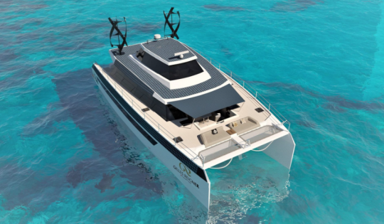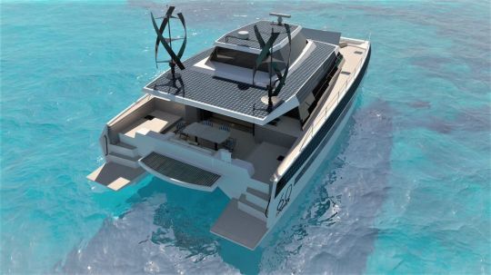 The GR63 features an electric propulsion system based on two 110 kW motors powered by a 284 kWh LiFePO? battery. A range of complementary energy solutions ensures extended autonomy: solar panels (12 kWp), vertical-axis wind turbines (10 kW), photovoltaic glazing and solar bimini, plus two 15 kW methanol fuel cells.
