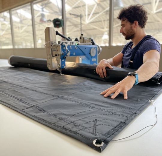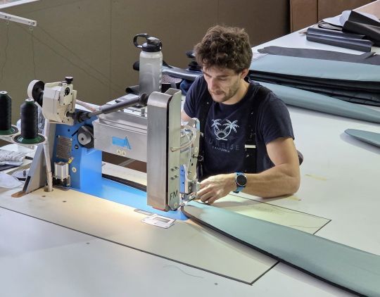 While the sails are made locally, the cutting is outsourced. Romain Bellet designs the models on computer before having them laser-cut in La Rochelle. This method ensures greater precision and adaptability to demand. Once the panels have been received, assembly is carried out by hand in the Le Pouliguen workshop, according to customer specifications.