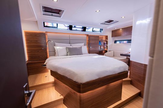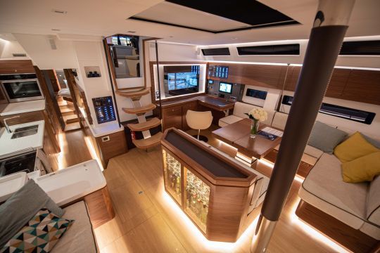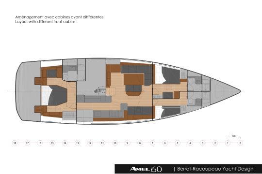 This Amel 60 model is presented with a revised interior layout. The huge aft cabin remains reserved for the owner, while the two forward cabins adopt a new configuration: a double cabin with armchair and dressing table, and a cabin with bunk berths. Each area retains its own private bathroom. This new layout is designed to meet the increasingly frequent requests from owners wishing to take their families or crew aboard.